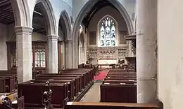 The exterior of All Saints' Church is flint with dressings of Totternhoe Stone. It has red tile roofs and a squat, buttressed bell tower with battlements and a "spike" or small central spire. The church is mostly in the Perpendicular style, but was heavily restored in the Victorian era. Internally, the nave has three bays with a clerestory and north and south aisles which both terminate in chapels, in line with the east end of the chancel.[2]