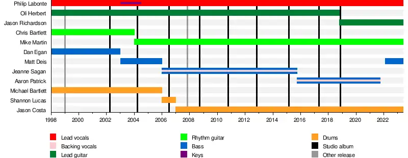All That Remains is an American metalcore band from Springfield, Massachusetts, formed in 1998.[1] They have released nine studio albums, a live CD and DVD, and have sold over a million records worldwide. The group currently consists of vocalist Philip Labonte, rhythm guitarist Mike Martin, former Diecast drummer Jason Costa, and lead guitarist Jason Richardson, with Labonte being the last remaining original member. In spite of this, the band's line-up had remained consistent from the release of 2008's Overcome until 2015's The Order of Things, spanning four albums. This line-up changed, however, in September 2015, when long-time bassist Jeanne Sagan left the band, with Patrick taking her place, and then again in February 2019, when the band confirmed that Jason Richardson would be joining the band to replace the deceased lead guitarist and original member, Oli Herbert. In 2021, Aaron Patrick parted ways with All That Remains to focus on his other band, Bury Your Dead.