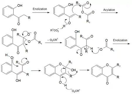 The o-hydroxyaryl ketone first undergoes tautomerization to form the respective enol. The pi electrons of the double bond then attack the electrophilic carbon of the anhydride; a carboxylate anion is subsequently lost as a leaving group. The carboxylate anion then attacks an alpha hydrogen to form an enol. The nucleophilic hydroxyl group then attacks the carbonyl carbon to form a six-membered heterocyclic ring. A proton is abstracted from the hydroxyl group of the enol to form a ketone, and the remaining hydroxyl group is lost as a leaving group in a concerted step to afford the final product.[4][5]