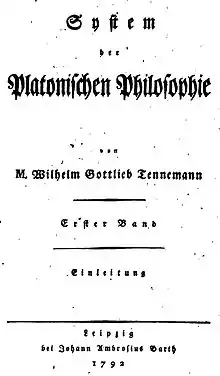- Tennemann's interpretation of Plato appeared in his 1792, four-volume System der Platonischen Philosophie (Jena: 1792–1795) and was summarized in his influential History of Philosophy (11 volumes, 1798 – 1819). References below are to the discussion of Plato in the 1799 volume II of Geschichte der Philosophie (Leipzig: Barth, 1799).