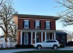 The two-story brick house exhibits elements of both the Italianate and Federal styles. It features a low-pitched hip roof, broad eaves without brackets, Federal influenced metal lintels on each window, a transom above the main doorway, and nearly full-sized front porch with heavy square wood posts. A two-story wing was added onto the back in the early 20th-century, and a carriage house was built about the same time. The house was listed on the National Register of Historic Places in 1975.[1]