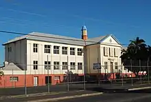 The area continued to develop in the early 20th century. Transport improved from 1909, with the introduction of an electric tramway system in Rockhampton (the only regional city in Queensland to have a tram system), with one route having a terminus in Upper Dawson Road near the school.[35][36] Allenstown State School expanded. New timber wings were added in 1899 and 1909, and the school buildings were raised and asphalt laid underneath in 1907.[37][38][39][40][41][42] From July 1913, the school offered high school classes, which appears to have been a short-term venture.[43] In 1915 a new building, an open-air annexe (Block C in 2019), was opened to accommodate infants classes. The 51 ft by 25 ft open-air annexe included a wall and a verandah on its south side, with the other three walls divided into 12 sections, with rollers for canvas blinds. Erected by Pugh Bros, it cost £814.[44][45][46][47][48][49][1]