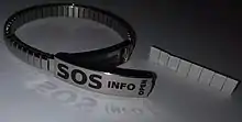 A medical identification tag is a small emblem or tag worn on a bracelet, neck chain, or on the clothing bearing a message that the wearer has an important medical condition that might require immediate attention. For emergency medical providers such as paramedics and emergency physicians, medical identification tags are particularly useful in situations where the wearer is unconscious, altered mental status, very young, or otherwise unable to provide critical medical information.[1] The tag is often made out of stainless steel or sterling silver. A wallet card with the same information may be used instead of or along with a tag, and a stick-on medical ID tag may be added or used alone.