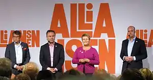 After defeat in the 2014 Swedish general election, the Moderate Party's parliamentary group leader Anna Kinberg Batra announced to the Riksdag that the political alliance "would operate in opposition". On 11 January 2019, during the 2018–2019 Swedish government formation, the Centre Party and Liberals agreed to tolerate the re-election as Prime Minister of Social Democratic incumbent Stefan Löfven.[4] Moderate Party leader Ulf Kristersson and Christian Democrat leader Ebba Busch denounced the agreement, with Busch calling the Alliance "a closed chapter".[5]