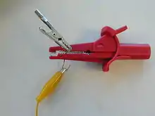 A crocodile clip or alligator clip[1] is a plier-like spring-tensioned metal clip with elongated, serrated jaws that is used for creating a temporary electrical connection. This simple mechanical device gets its name from the resemblance of its serrated jaws to the toothed jaws of a crocodile or alligator. It is used to clamp and grab onto a bare electrical cable to an lead on a battery or some other electrical component. Functioning much like a spring-loaded clothespin, the clip's tapered, serrated jaws are forced together by a spring to grip an object. When manufactured for electronics testing and evaluation, one jaw of the clip is typically permanently crimped or soldered to a wire, or is bent to form the inner tubular contact of a ~4 mm (0.16 in) female banana jack, enabling quick non-permanent connection between a circuit under test and laboratory equipment or to another electrical circuit. The clip is typically covered by a plastic shroud or "boot" to prevent accidental short-circuits.