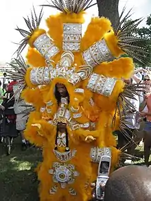 The start of Carnival involves the Chief marching in the back of his tribe, while non-costumed followers trail behind the Indians, known as a second line. Ahead of the tribe is a "Spyboy" who is a block or two ahead. He will motion to the "Flagboy" if the road ahead is clear or not. The "Flagboy" will then alert the chief.[11] The chief will then make the decision as to what road to take. Because of the ambiguous nature of the Indians, there is no telling what path they make take around New Orleans. This makes finding their exact location difficult to pinpoint each year. When two tribes meet each other on the same path, they will have a battle. This battle no longer involves bloodshed and weapons, but chanting and dancing, as well as an informal competition as to which chief has the "prettiest" suit.[10] The chants are in a native language, and can tell a story, shared experience or taunt the opposing tribe. The relationships between the tribes have become calm since the work that Tootie did with changing the traditions of the Mardi Gras Indians.