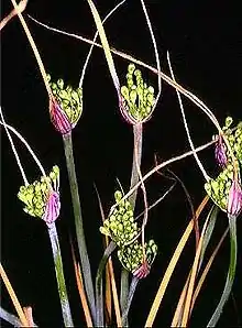 Allium nebrodense is unusual in the genus is that the scape is not erect but rather ascending (horizontal in the lower part, then curving upwards). Spathes are also unusual in their conspicuousness, narrowing to a pair of long red claws on either side of the umbel, much longer than the umbel itself. The flowers themselves are yellow.[5][6]