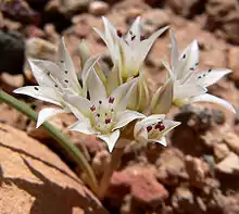 The Nevada onion grows from a brown or gray bulb one to one and a half centimeters wide which may have one or two daughter bulblets associated with it. The stem may appear short if the bulb is more than a few inches below the surface of the ground. The stem is topped with an umbel of up to 25 flowers. The tepals may be white or pink-streaked with darker midveins; anthers purple; pollen yellow.[1][4][5][6][7]