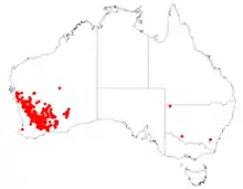 Allocasuarina acutivalvis grows in tall heath and open woodland, sometimes on rocky hillsides, and is widespread in the south-west of Western Australia from north of the Murchison River to Zanthus.[2][10][11] Subspecies prinsepiana occurs from near Mullewa to near Merredin, surrounded by and sometimes intergrading with subsp. acutivalvis.[13][14]