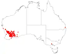 This sheoak grows in tall heath on sandplains between Wubin and Norseman in the Avon Wheatbelt, Coolgardie, Esperance Plains, Mallee and Murchison bioregions of south-western Western Australia.[2][3]