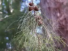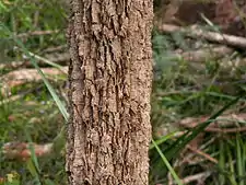 Karri oak usually grows as a medium tree 8–15 m (26–49 ft) high, although in harsh, exposed situations in places like the top of Bluff Knoll it is a stunted shrub or poorly-formed tree in shrubland. As with other members of the family Casuarinaceae, the foliage consists of wiry green branchlets called cladodes with rings of minute leaf scales. In this species, the branchlets are about 140 mm (5.5 in) long, roughly square or X-shaped in cross section, with four scale-teeth in each ring. The rings of scale-leaves are 7–9 mm (0.28–0.35 in) apart. Separate male and female flowers form on the same individual plant. The fruiting structure is a woody cone, shaped like a short cylinder with its diameter roughly equal to or slightly greater than its length. The fruit is a winged samara 7–9 mm (0.28–0.35 in) long.[4] It often grows in association with Acacia pentadenia[2] and Asplenium aethiopicum often grows as an epiphyte on its branches.[4]
