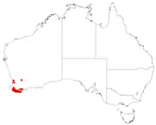 Karri oak is restricted to the southwest of Western Australia in the Esperance Plains, Jarrah Forest and Warren biogeographical regions. It grows on loam in the karri forest but also found on much poorer soils in the Stirling Range.[3]