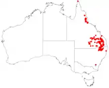 In New South Wales it occurs in areas such as the Clarence River valley, Emmaville, Yetman,[4] south to Waralda, while it ranges in Queensland north to Herberton.[6] It is found in woodland on sandstone, ironstone or laterite ridges.[4][6] Associated species include grasstrees (Xanthorrhoea) and eucalypts, such as drooping ironbark (Eucalyptus caleyi).[7]