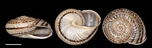Allognathus hispanicus (now known as Allognathus balearicus) is a species of land snail in the family Helicidae, the true snails. This species is endemic to Mallorca, one of Spain's Balearic Islands.[1] The common name is "caragol de Serp" (snake snail), due to the pattern of it shell.