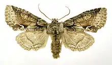 M. oxyacanthae L. (31 g). Forewing reddish grey, varied with fuscous; the nervures and inner margin lined with green scales; a strong black streak from base below cell; lines finely black, the inner sharply angled outwards at the end of the basal streak, the outer marked with a bright white crescent on submedian fold; stigmata all large, pale pinky brown, outlined with black; a diffuse black shade to termen below vein 2; submarginal line faintly paler, the area before it generally paler; hindwing luteous whitish in male, grey in female. The form found in Syria, benedictina Stgr. (31 g) [now full species Allophyes benedictina (Staudinger, [1892]) ]has the forewings dark grey brown; the hindwings paler; but those of the female are darker grey; — another form, occurring in Pontus, Palestine and Ussuriland, asiatica Stgr.[ now full species Allophyes asiatica (Staudinger, [1892]) has the fore-wings pale grey; capucina Mill. (31 g h) is a form restricted, apparently, to the British Isles, rich deep brown with darker shading in the male, darker duller brown in the female, with the lines and markings distinct, the hindwings of the male often rufous-tinged; in this the green scaling is altogether absent; — corsica Spul. [now full species Allophyes corsica (Spuler, 1905)] from the Island of Corsica is said to be paler, of a more vivid yellowish red colour; — pallida Tutt, from Ireland and Berkshire, has pale reddish grey forewings, with only a slight amount of green along inner and outer margins. Larva dull slaty grey or brownish grey, covered with irregular-shaped black marks; on each side of segment 4, which is slightly raised, an oblique dark streak; tubercles pale on dark spots; spiracles fine, white, with black rings.[1] The wingspan is 35–45 mm.