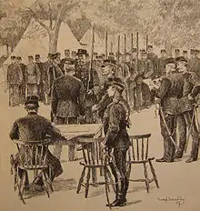 In 1812, a new system was introduced, requiring all males between age 20 and 25 to serve in the armed forces twelve days a year, changing in 1858 to four weeks per two years.[11] At the same time, the new allotment system remained in use up until 1901, when mandatory conscription, with 8–9 months of military service, was introduced. The allotment system was finally abolished in 1901. From that time, regiments began to be garrisoned in towns instead of being spread all over the province with a training ground as the only common meeting place. As croft soldiers were contracted by the government for as long as they wanted and were fit for service, and as they could not be dismissed, some soldiers lived under the allotment system long after 1901, the last one retiring as late as 1961.[12] Through the reform, the regiments' local connections were partially lost, as conscripts were not necessarily from the regiments' respective provinces. Before the reform, soldiers of the same company generally stemmed from the same village and region.