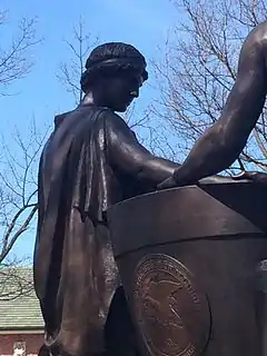 The Alma Mater is a bronze figure of a woman in academic robes. She stands in front of a stylized throne, or klismos, with her arms outstretched in welcome. The attendant figure "Labor" is a male who stands to her proper right and wears a blacksmith's apron. At his feet lies a sheaf of papers. The proper left figure "Learning" is a female robed a classical gown with a sun bas-relief on front. Learning and Labor extend their hands in a handshake over the throne.[3] The work stands approximately 13-feet tall. The granite base carries three inscriptions: