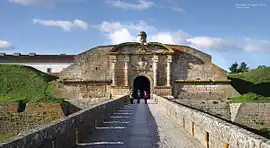The fortress around the town guards an important cross-border road from Spain, and underwent several sieges. The siege of 1810, during the Peninsular War,[13] ended spectacularly when a chance shell ignited the main gunpowder magazine, which exploded, killing 500 defenders and destroying most of the town.[14]