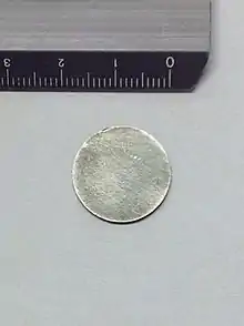 An Almen round is a thin round disk used to quantify the intensity of a shot peening process. Developed in 1994 by Rudolf Bosshard in Switzerland, it is a modification of the Almen strip method, which is used worldwide as a surface treatment testing method[1] in the field of shot peening. The basic principle is the same, but due to the simple shape and minimized size, the Almen round is more suitable for automated processing and installation on dummy rigs. Also instead of the Almen block according SAE J442,[2] here a matching device is used and if connected to electronic processing unit, the Almen value[3] according AMS-S-13165 (predecessor MIL-S-13165 Rev.C) can be evaluated in one run.