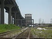 ![]() View from the Danziger Bridge looking riverwards, with the large I-10 highrise bridge and the smaller Almonaster Avenue Bridge in raised position below and behind it. | |