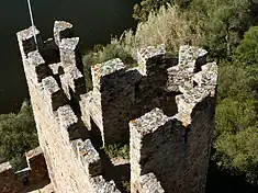 The castle has an irregular rectangular plan consisting of two enclosures: an exterior lower level faces upstream with a traitors' gate and walls reinforced by nine tall circular towers; while the interior enclosure, located at a higher elevation, has walls accessible by the main gate to the main keep.[1][2] The keep is three stories tall, and includes the original pads that supported the main truss.[2] The remaining sentry towers are irregular, owing to the irregular terrain.[1][2] The keep is actually an innovation at this castle, appearing in the 12th century after the Castle of Tomar, the principal defensive redoubt of the Templars in Portugal.[1][3] Similarly, the watchtowers were innovations brought into the western Iberian peninsula by the Templars, and applied in Almourol.[1]