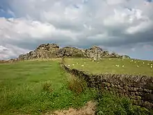 Almscliffe Crag, or Almscliff Crag, also known as Great Almscliff Crag to distinguish from Little Almscliff, 3 miles (5 km) north west, is a Millstone Grit outcrop at the top of a small hill near the village of North Rigton, between Leeds and Harrogate in North Yorkshire, England. The crag lies on the boundary of the civil parishes of North Rigton and Stainburn. The crag was formed due to the softer adjacent strata of shale and mudstone eroding at a faster rate than the hard wearing millstone.[1]