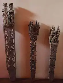 The aloalo is a funerary pole sculpture that, along with the skulls of slaughtered zebu, is placed on the tombs of important people in the south-western region of Madagascar. Originally, aloalos were only available for wealthy individuals, but later the wealthy could purchase them. The memorial may help the deceased to join the community of ancestors, since the word alo means 'intermediary' or 'messenger' in Malagasy. These carved posts often tell the story of the person's life and generally take the form of a series of geometric or symbolic shapes topped by sculpted figures or objects evocative of the deceased's life, or desirable material possessions. The zebu represents prosperity and the aloalo usually has a combination of nude human figures and birds. They are chiefly associated with the Mahafaly people,[1][2] although they are also found on the tombs of some Antandroy and particularly the Sakalava, whose carved figures are reputed for their often erotic imagery.[3]