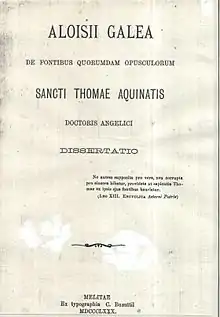 - 1885-1900 – Tractatus de Trinitate Summæ Theologicæ Sancti Thomæ Aquinatis (A Study on the Trinity according to the Summa Theologica of Saint Thomas Aquinas).[5] This work is still in manuscript form,[6] and bears an additional title, namely: Aliarum septemdecim Quæstionum (And of Seventeen More Questions). It contains some 492 folios, and is divided in questions and articles as in the style of Scholasticism. The work rests heavily on Pope Leo XIII’s Æterni patris of 1879. It basically offers a philosophical discussion on the doctrine of the Trinity or, alternatively, on the nature of God.