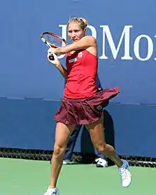 Alona started her clay-court season at the MPS Group Championships. Seeded second, she lost in the first round to eventual finalist Olga Govortsova.[7] In Charleston at the Family Circle Cup, Alona was the ninth seed. She reached the third round after wins over Julie Ditty and Bethanie Mattek-Sands. She was defeated in her third-round match by seventh seed and eventual finalist Vera Zvonareva.[8] In the Fed Cup tie against Australia, Alona lost her match to Anastasia Rodionova.[9] Ukraine ended up losing to Australia 0–5. After playing Fed Cup in Ukraine, Alona flew to Madrid to compete at the Madrid Open. In the first round, she came back from a set down to defeat Magdaléna Rybáriková. She then gained the biggest win of her career by defeating world No. 2, Caroline Wozniacki in the second round.[10] Alona was defeated in the third round by 13th seed Li Na.[11] Seeded sixth at the Warsaw Open, Alona was upset by qualifier Gréta Arn in the quarterfinals. Seeded 27th at the French Open, Alona reached the third round for the first time, but she lost to fourth seed Jelena Janković.[12]