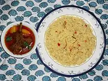 Aloo gosht (Hindi: आलू गोश्त, Urdu: آلو گوشت, Bengali: আলু গোশ্ত, romanized: Alu göshto, Assamese: আলু গোছ, romanized: Alu güs) is a meat curry, and is a popular dish in North Indian, Pakistani, and Bangladeshi cuisine. It consists of potatoes (aloo) cooked with meat (gosht), usually lamb or mutton or beef, in a stew-like shorba gravy.[1][2] It may be considered a curry, stew, or shorba depending on the way the dish is prepared, the types of spices used and what country or particular region it was made in. The dish can be served and eaten with plain rice or with bread such as roti, paratha or naan.