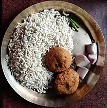 Aloo Chop (Bengali: আলুর চপ, Odia: ଆଳୁ ଚପ)[1] a snack originating from the Indian subcontinent made out of boiled potatoes and various spices. It is available widely in the Indian states of Odisha, Assam and West Bengal, and in Bangladesh. "Aloo" means potato, and the word "chop" means a small cutlet fritters or croquette in Bengali. It is served hot and warm along with muri (puffed rice), green chilies, and sometimes sauce and salads. It is a vegetarian alternative, and an equivalent of aloo tikki.[2]
