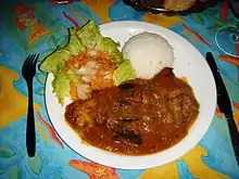 Mauritius is known for its sauces and curries which are typically served with meat, seafood, and vegetables dishes.[1] Other common preparations are chutney, archard, and pickles.[3] The Mauritian curries are unique as they rarely contain coconut milk, typically uses European herbs (e.g. thyme), and uses more variety of meat (e.g. duck) and seafood (e.g. octopus).[2] The rougaille (also written as "rougay") is a tomato sauce cooked with onions, garlic, chillies, ginger and variety of spices, which is popular; it can be eaten with fish, meat and vegetables.[1][2][8][9] The Mauritian versions of curry, chutney, rougaille, and pickles have a local flavour and differ, at times considerably, from the original Indian recipes.[5]