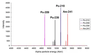 From left to right the peaks are due to 209Po, 239Pu, 210Po and 241Am. The fact that isotopes such as 239Pu and 241Am have more than one alpha line indicates that the (daughter) nucleus can be in different discrete energy levels.
