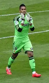 On 23 July 2013 he was loaned to Ligue 2 side Lens, who were managed by former PSG manager Antoine Kombouaré, for the 2013–14 Ligue 1 season.[9] Areola immediately displaced Rudy Riou as the club's starting 'keeper and made 36 appearances for the campaign, included in which was his Coupe de France debut. He also helped the club to a second-place finish in the league, thereby earning promotion to Ligue 1.[10] Areola's performances throughout the course of the season earned him the Ligue 2 Goalkeeper of the Year award and a spot in the Team of the Season.[11] He was also awarded the Eurosport Revelation of the Year award, beating the likes of N'Golo Kante and Gaëtan Bussmann.[12] A verbal agreement was in place for Areola to remain with Sang et Or on loan for the following season but the club's financial position raised concerns with the League's National Directorate of Management Control and ultimately put paid to the possibility of him returning.[13]