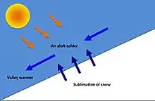 Due to wind, fresh snow does not stay at the surface but is blown into the first few meters of the surface layer. This blowing snow usually sublimates due to the insulation and has a significant meteorological effect . The sublimation of blowing snow leads to a modification of the energy budget and an overall temperature decrease of 0.5 °C combined to an increase of water vapor has been observed.[9] This forms a stable cold and moist layer of air above the snow surface, even if the surrounding air temperature is above freezing point. This cold layer induces downslope winds, which damper the growth of the PBL. This surface winds are also drifting the snowpack, leading to an increase of surface roughness and therefore an increase of wind shear (Forced convection).