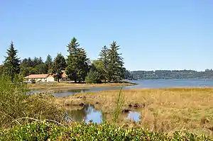 The Alsea River flows 48.5 miles (78.1 km) from Alsea, an unincorporated community in the coastal mountains of the U.S. state of Oregon, to the Pacific Ocean near the city of Waldport. It begins at the confluence of the North Fork Alsea River and the South Fork Alsea River and ends in Alsea Bay, a wide estuary at Waldport.[4] The river flows generally west-northwest in a winding course through the mountains of southern Benton and Lincoln counties, passing near the unincorporated community of Tidewater and through the Siuslaw National Forest. Its drainage basin extends into Lane County, along the headwaters of the South Fork Alsea River.