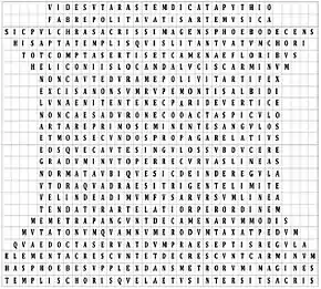 Finally there is a poem written in Latin by Publilius Optatianus Porfyrius dating from the first quarter of the 4th century. In this the altar describes its construction as “polished by the craft of the poet's musical art (fabre politavitis artem musica)…I am straightly confined and hold back my edges as they attempt to grow and then, in the succeeding portion, let them spread more broadly." It then elaborates in an equally self-descriptive way.[3] The poem has been judged to be 'undoubtedly a direct imitation of “Jason’s Altar”' by Dosidas.[4]
