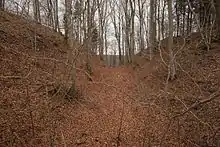 The tongue-shaped plateau of around 2 hectares is closed off towards the north east by two exterior ramparts, a deep moat and a large main rampart. Even today, the top of the main rampart is up to 12 meters above the bottom of the moat. Towards the valley the plateau is flanked by two terraces, 15 (north west) and 20 meters (south east) below the top. At the bottom of the slope another rampart and moat surround the hill. The entry to the fort was likely to the north east.[2]: 28