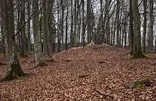 The plateau had been increased in size by the construction of dry stone walls that were then filled with rubble (stone and clay). Small stone walls on top of the plateau were built, with one cutting across the plateau in the centre, thus dividing the level area in two halves.[2]: 29 This was the line later followed by the municipal border.