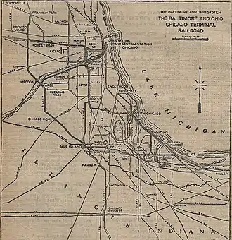 The B&O's South Chicago was located approximately at 94th Street and Commercial Avenue, slightly to the southwest of the Calumet River's opening to Lake Michigan. Additionally, the Pere Marquette Railway's Night Express to Muskegon and Grand Rapids, Michigan and its Resort Special to Bay View, Michigan, also used the B&OCT lines through the city, as well as the two stations on the approach to Grand Central Station. The B&O's 63rd Street Station, in the South Lynne section of the city was the company's other station within Chicago en route to Grand Central Station.[2][3][4]