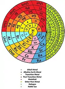 Muzzammil Qureshi's periodic table consists of concentric circles format giving it a more organic and more unified sense than the tabular formats. Discoid means "circular in shape".[14] This table instead of having "groups" and "periods” possesses "families" and "arcs" for the representation of elements. All the elements in the column are identified vertically by their Family name using the topmost element name. For example, lithium family, beryllium family, and so on. Elements are identified horizontally using the number of arcs. For example, 1st arc, 2nd arc, etc. The periodic table is divided into two parts, namely part A and part B. Part A represents the main-group elements, whereas Part B represents the transition metals.