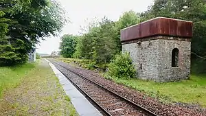 The reason for the station's construction is a mystery. At the time of construction it was 8 miles (13 km) from the nearest settlement and 10 miles (16 km) from the nearest road.[7] The only source of traffic at the station, Lochdhu Lodge, approximately 1.5 miles (2.4 km) to the south, was not built until 1895 and the Altnabreac School was not built until 1930. However, it had a passing loop with a water tank so may have been established for purely operational reasons. The water tank has not seen regular use since 1962[8] and the line was singled in 1986;[9] both the water tank and the old second platform can still be seen.