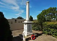 The Alton Downs War Memorial was officially unveiled on 16 October 1920 by Mrs H.G. Wheeler to honour those from the district who served in World War I. The memorial is made of Ulam marble and is a 12-foot (3.7 m) broken column (signifying young life cut short). It cost £180 to erect and the stonemason was Frederick Moulton Allan of Rockhampton.[7][8][9]