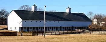 The 198 feet (60 m) long bank barn is built on a cut local limestone foundation, with weatherboard forebay and upper level. Two large square cupolas are placed over old and new sections of the barn. The original brick gable of the old barn remains in the interior where the old and new sections join. Stalls are found in the old section, while the newer section is a large loafing shed.