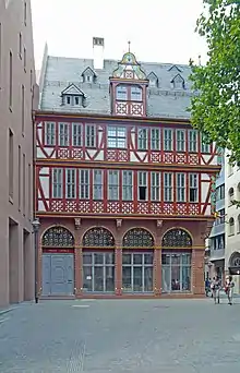 The Wertheim House (around 1600), is the only completely undamaged preserved half-timbered house in the old town. It is an ornate three-story Renaissance house with the stone ground floor common in Frankfurt. Opposite is the Rententurm, an important Frankfurt port building, where customs duties and port fees were collected. It was completed in 1456.