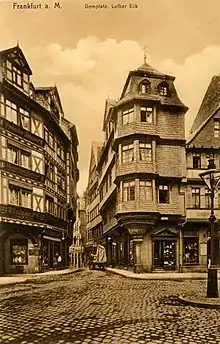 At the same time, however, one began to discover the picturesque sides of the old town and open it up to tourism. On many half-timbered buildings, the plaster applied in the early 19th century was removed and the compartment was often painted historically afterwards. The painting preferred to refer to Frankfurt's important past, so that well-known postcard motifs were created in the touristically important places such as the Roseneck or the Five-Finger Square.
