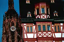 The historic old town of Frankfurt was one of the largest half-timbered towns in Germany until the extensive destruction in World War II with its around 1250 half-timbered houses, most of which date from the Middle Ages.[2] It was one of the most important tourist attractions for Germany. The historic old town was largely destroyed by the air raids on Frankfurt am Main in 1944. The streets and the entire district are predominantly characterized by quickly and easily erected buildings from the 1950s and 60s. A handful of the most important historic buildings, churches and squares were restored or reconstructed, especially around the main square, the Römerberg.