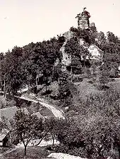 The first documented mention of the Château de Windstein is dated 1205. It was built at the end of the 12th century by the Hohenstaufens to protect their imperial palace at Haguenau. The castle was a fief of the Empire, in the possession of the Windstein family, and was built in two periods, though dates are not known. Later, the castle was split in two with the lords of Sickingen and Schmalenstein each owning a part. Some buildings were constructed in the 13th century but it later became a haunt of brigands and was razed in 1332,[2] following a conflict with the city of Strasbourg. Despite a ban on rebuilding, it was rebuilt again during the course of the 14th century. Burned in 1515, it passed into the possession of the Durkheims. The castle was finally ruined at the end of the 17th century, destroyed by the artillery of General Joseph de Montclar in 1676 during the wars against Louis XIV.[1]