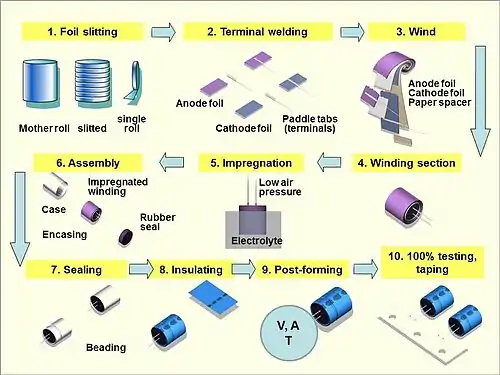 - Rubycon, Technical Notes for Electrolytic Capacitor, 2. Manufacture of Aluminum Electrolytic Capacitor PDF Archived 2013-12-30 at the Wayback Machine