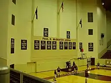 Built in 1963, the Paul S. McBrayer Arena located inside Alumni Coliseum, is capable of seating around 6,500 people in both chairback seats and on wooden benches (8,000 for concerts) arranged in a horseshoe shape, facing a wall at the right side of the arena where staging is usually set up for events. The arena's ceiling is made completely of wooden beams and is believed to be the largest of its kind in existence. It was named for the former EKU Men's Basketball Coach Paul McBrayer who compiled a record of 219-144. The floor graphics were updated for the 2005-06 seasons and the banners were redone to be more unified. The building replaced Weaver Gymnasium, which had been home to the Colonels since 1930.